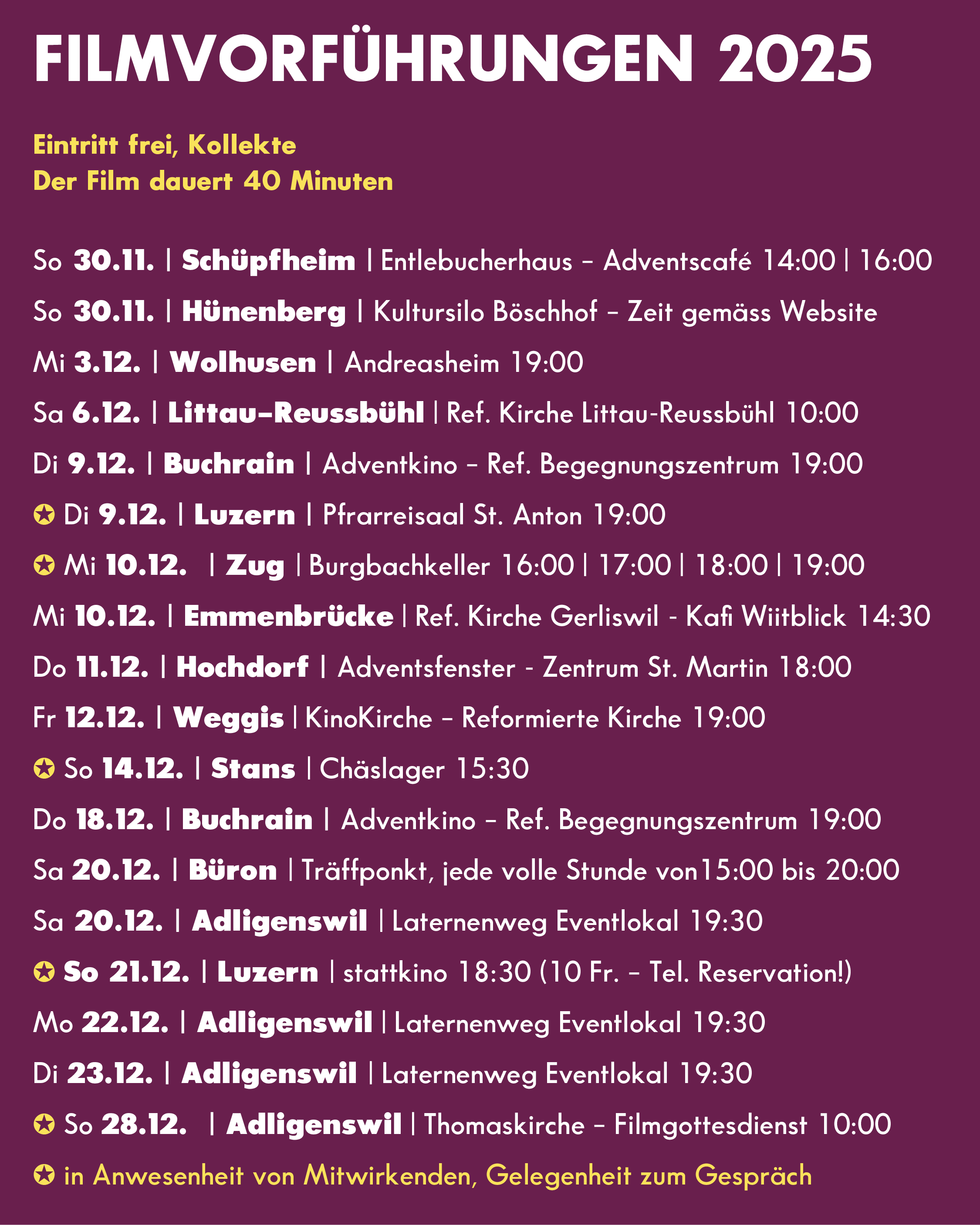 10. November 2025Ab 30. November geht "Heiliger Schein" auf Tour! An 18 Orten wird unser Film in der Zentralschweiz gezeigt und lädt das Publikum zum Geniessen und Diskutieren ein. Bei vier Vorstellungen werden auch Mitwirkende des Films anwesend sein. Alle Informationen gibt es auch im Flyer.