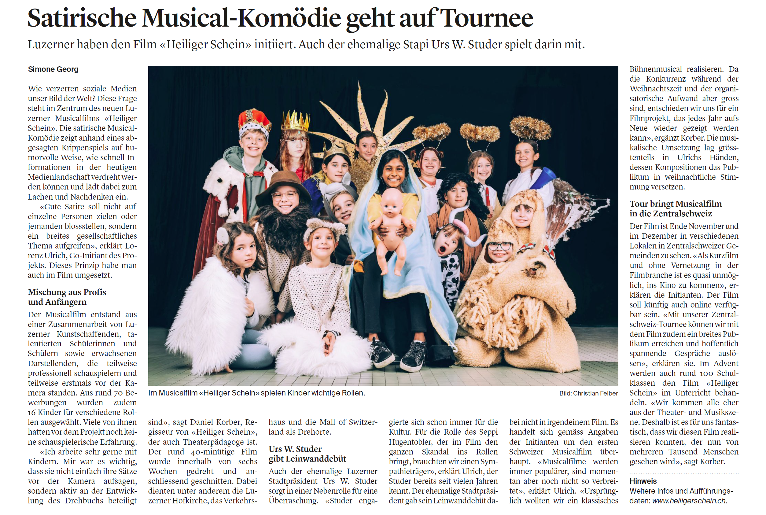Zudem wird "Heiliger Schein" von mindestens 100 Schulklassen in der Zentralschweiz im Rahmen des Unterrichts und von Weihnachtsanlässen behandelt und gezeigt. Interessierte Schulen und Lehrpersonen dürfen sich nach wie vor informieren und anmelden.